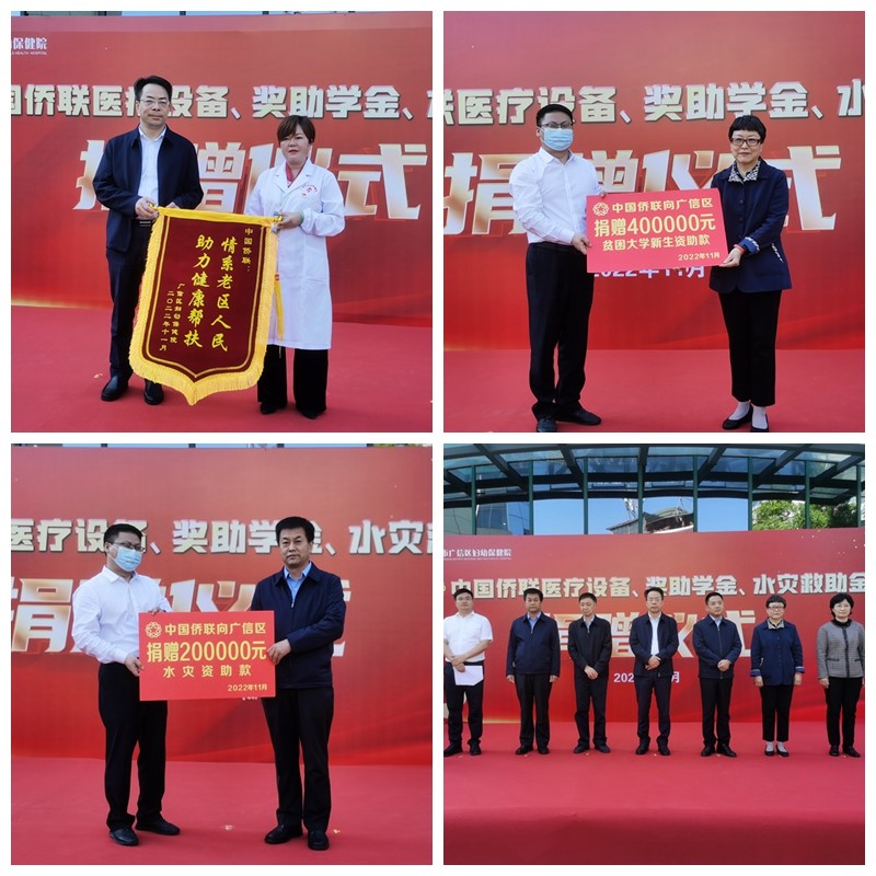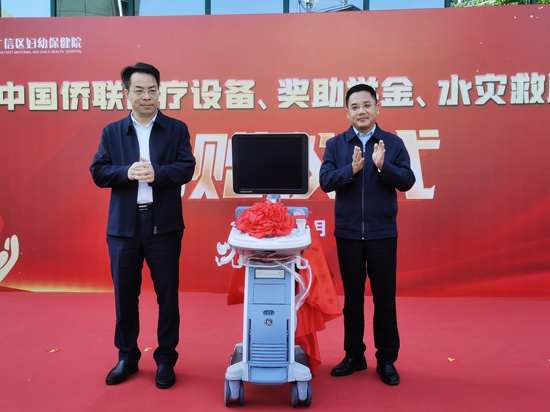 在中国侨联向广信区捐赠医疗设备、奖助学金、水灾救助金的捐赠仪式上,连小敏与上饶市副市长郭峰为价值150万元的医疗设备揭幕,中国侨联权益保障部部长张岩、基层建设部副部长刘景春分别代表中国侨联向广信区红十字会捐赠40万元奖助学金和20万元水灾救助金,广信区妇幼保健院党支部书记周桂莲代表受赠方致辞并向中国侨联敬献锦旗。广信区委副书记、区长顾海敏主持捐赠仪式。