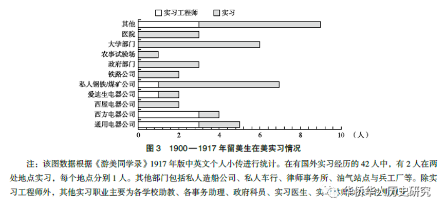 1900—1917年,在美实习的学生人数不断增加,初步统计约有42人,涉及到多个行业部门。其中,职位明确为实习工程师的有11人,未标明实习职位的有31人。从实习机构看,留美生的实习质量较高,大都在当时美国顶尖的公司或工厂,如普通电气公司、西方电气公司、西屋电气公司、纽约爱迪生公司、纽约造船公司、美利坚造船厂及煤油公司、矿业公司、电话公司等实习。在美国相关政府部门,如纽约铁路交通局、美国工商部、农事试验场、华盛顿国家图书馆等部门,也可以看到留美生实习的身影。商科的学生则争取到在美国各大银行实习的机会。此外,部分学生还在高等学校,如麻省理工大学、伊利诺伊大学等高校实习。整体而言,留美生实习已非个案,且实习单位较为广泛(见图3)。