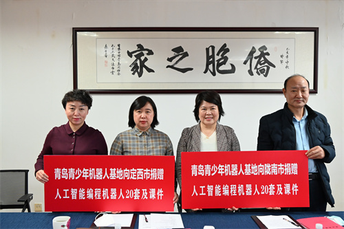 会上,青岛市侨联分别与陇南市委统战部和定西市侨联签订了《加强青·陇协作 开展对口支援协议书》《加强青·定协作 开展对口支援协议书》,青铁体育与陇南市委统战部、定西市侨联签订了《“足球援助·侨界助力”战略合作协议》,青岛机器人训练基地与陇南市委统战部、定西市侨联签订了《器材捐赠协议》,青岛市侨联、青岛青少年机器人基地向陇南市委统战部、定西市侨联捐赠了价值12万元的足球、训练服和40套价值7万元的人工智能编程机器人及课件。