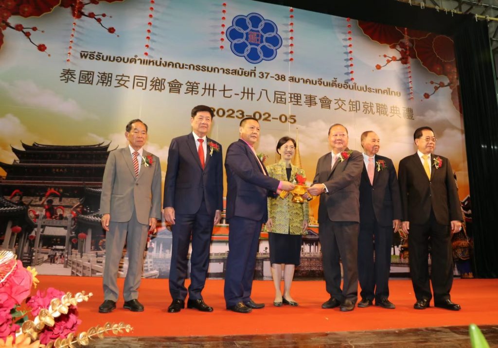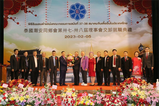 2023年2月5日,泰国潮安同乡会举行第三十七-三十八届理事会交卸就职典礼。中华人民共和国驻泰王国领事公参兼总领事潘瑾阁下,泰国中华总商会主席林楚钦,泰国潮州会馆主席徐惠深,泰华各姓宗亲总会联合会主席黄汉良,泰国中国和平统一促进总会会长王志民,泰国中华总商会副主席李桂雄,泰国潮州会馆永远名誉主席黄迨光,泰华进出口商会永远名誉理事长郑岳龙,华侨报德善堂副理事长徐光辉等应邀出席典礼。