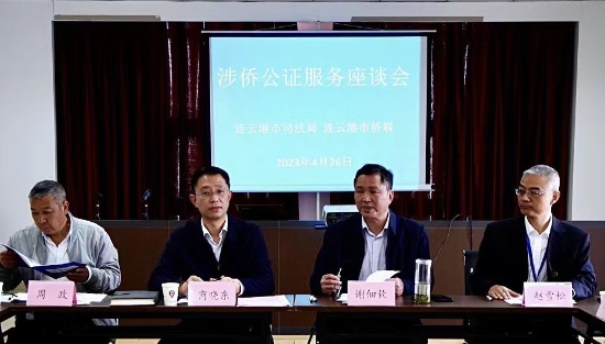 4月26日,市侨联与市司法局在连云港公证处召开涉侨公证合作座谈会,市侨联党组书记、主席商晓东,市司法局党委委员、三级调研员谢佃钦,市侨联党组成员、四级调研员周政,市司法局公证管理处处长王海燕,连云港公证处主任赵雪松,市侨联法律服务中心、好年华出国留学服务有限公司、 江苏江海国际经济技术合作有限公司、连云港正达司法鉴定中心、连云港云兮中欧文化交流有限公司等单位代表,市侨联、连云港公证处、海州区侨联及市侨青会相关人员参加了座谈会。