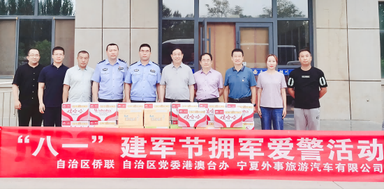 7月27日,在第96个“八一”建军节来临之际,宁夏侨联联合宁夏党委港澳台办、侨企宁夏外事旅游汽车有限公司,先后赴银川市西夏区退役军人事务局、西夏区交警二大队和镇北堡派出所开展“八一”建军节慰问老兵及拥军爱警活动,为退伍老兵送上慰问品和节日的问候,向炎炎夏日奋战在基层一线的公安干警送上清凉饮品,感谢他们对国家、社会和人民的辛勤付出,并向他们致以崇高的敬意。
