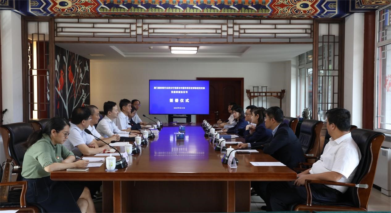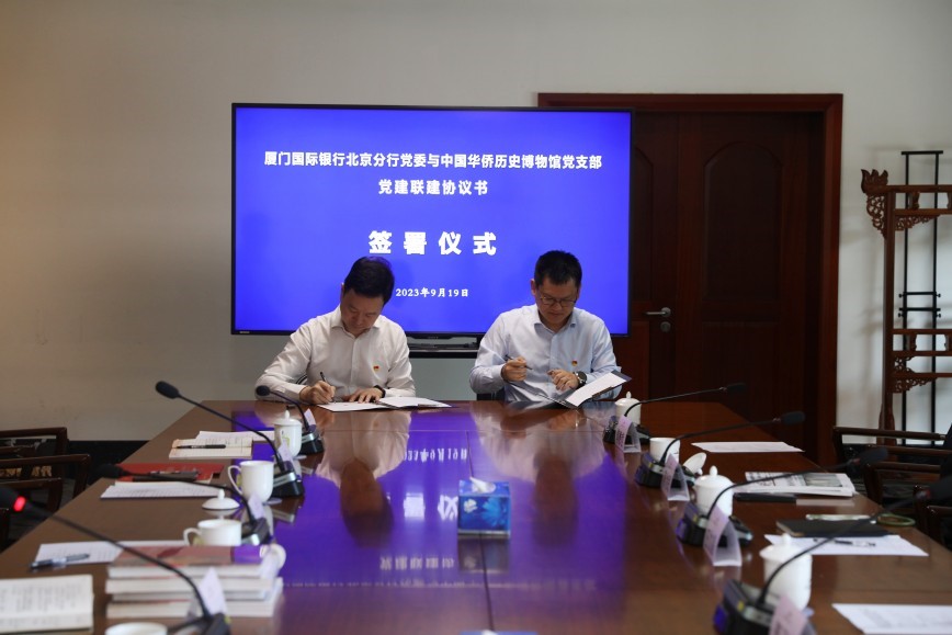 9月19日上午,中国华侨历史博物馆与厦门国际银行北京分行举办党建联建协议签约仪式,中国华侨历史博物馆党支部副书记、副馆长宁一,厦门国际银行北京分行党委书记、行长郭子润代表双方签约,中国华侨历史博物馆党支部副书记、副馆长贾德成,集友银行厦门分行华侨金融部副总经理陈为民,集友银行厦门分行普惠及零售金融部总经理吴志阳以及双方相关代表共同出席签约仪式。