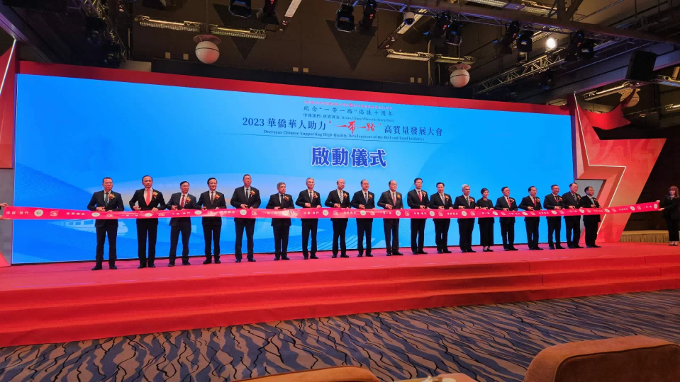 27日下午,由中国侨联和澳门归侨总会共同主办的2023华侨华人助力“一带一路”高质量发展大会在澳门旅游塔举行。澳门特别行政区行政长官贺一诚,中央政府驻澳门联络办公室主任郑新聪,中共中央统战部副部长林锐,外交部驻澳门特派员公署特派员刘显法,中国侨联副主席程学源,中国侨联副主席、澳门归侨总会永远会长刘艺良,澳门归侨总会会长刘雅煌等出席大会并担任主礼嘉宾,来自60多个国家和地区的100多个侨团领袖、青年代表和澳门社会各界人士500余人共襄盛事。