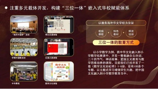 未来,温州大学将注重多元载体开发,构建完善的“三位一体”嵌入式华校赋能体系。学校将以服务海外华文学校为宗旨,打造“视频课程+特色教材+师资培训”三位一体的教育架构。以小学数学为例,学校将中华文化融入到小学数学拓展课中,开发一整套融合古诗词、二十四节气、神话故事、爱国主义教育与数学思维培养的课程。目前学校已开发了一套《数学文化彩虹桥》1-6册,设有100多个专题,以主题式学习增强学生兴趣,把中国文化融入到小学数学教育当中。利用这套课程体系,海外华文学校每个班只需要配备一名辅导教师,就可以完成高品质数学课程的嵌入教学。此外,学校还创设了温州南拳-五祖拳,走进南戏、体验瓯剧,红楼梦人物艺术鉴赏等地方特色文化课程,赋能海外华文学校教学内容创新。温州大学将不断发挥侨教育优势、师范教育优势以及附属学校丰富的教育资源,给予海外华文学校高品质、全方位教学服务与指导,打造全球华侨华人交流中心和精神家园。