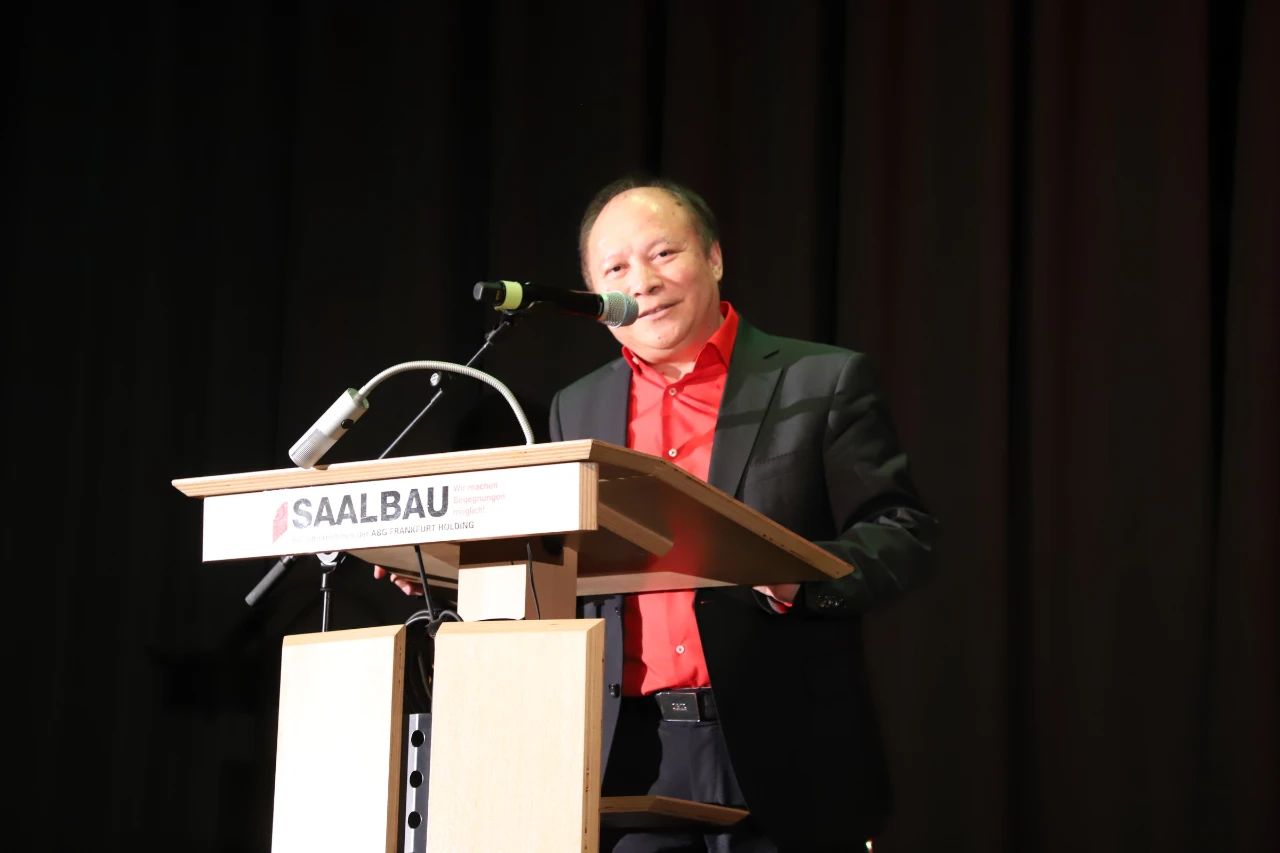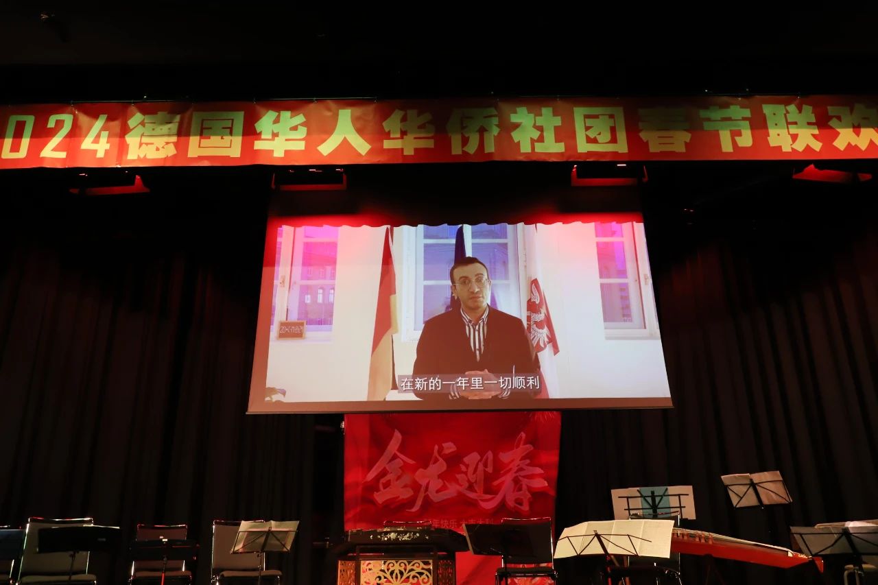 市长迈克·约瑟夫通过视频形式向联欢会现场观众致以龙年的新年问候,指出龙代表力量、强大和能量,也象征幸福和繁荣富裕。约瑟夫表示,法兰克福是德国最国际化的城市,华人社区在城市社会中尤其做出了非常重要的贡献,作为市长,他非常感谢。他以此前接待广东省代表团为例,指出当前时代挑战颇多,各方团结在一起才能应对挑战、创造和平,呼吁市民齐心协力,为城市建设继续做出贡献。