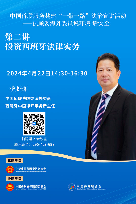 第二讲将于4月22日下午14:30开始,由中国侨联法顾委海外委员、西班牙律师季奕鸿主讲。