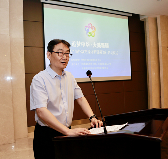 采访团团长、中国侨联信息传播部部长左志强,新疆自治区侨联党组书记、主席任澄,新疆自治区党委宣传部常务副部长赵江涛出席启动仪式并致辞。新疆自治区侨联党组成员、副主席米海尔古丽·阿吉主持。