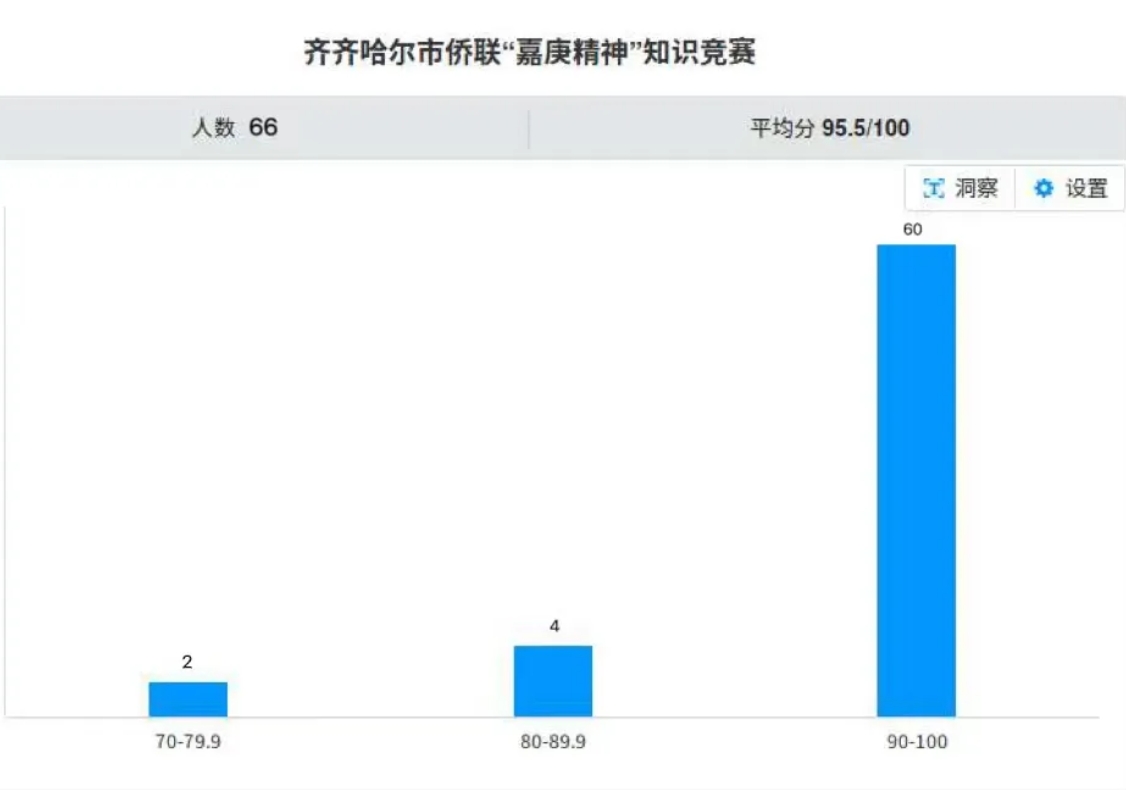 6月24日-6月26日,齐齐哈尔市侨联举办线上“嘉庚精神”知识竞赛,共有66人参加,其中包括市侨联委员、侨商会会员、侨界群众。此次答题平均分95.5,共有60人得满分,充分展现了侨界群众学习“嘉庚精神”的热情。