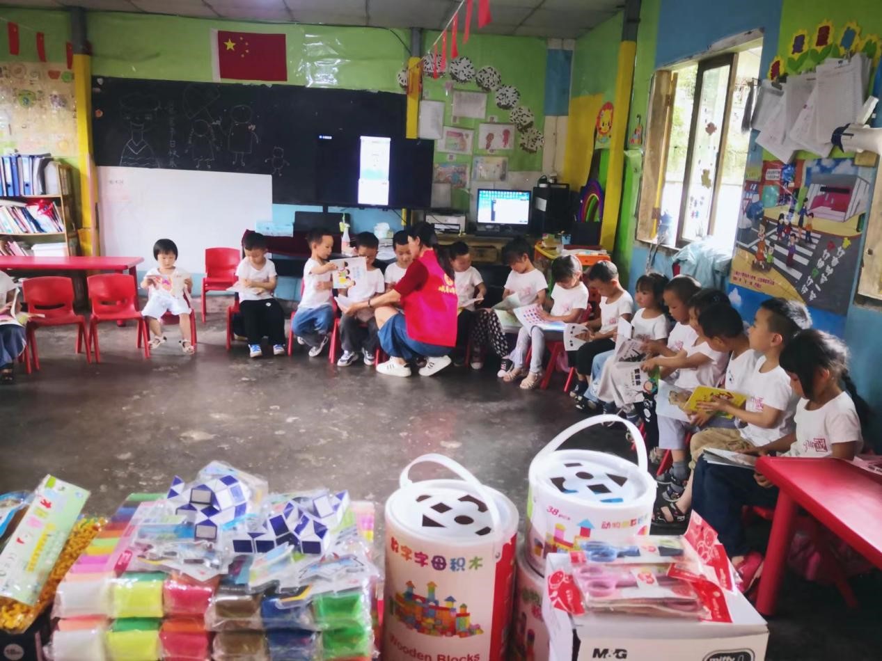 志愿者们为孩子们送上了水彩笔、粘土、积木等教玩具、幼儿绘本300多册,并和孩子们一起阅读、讲故事。孩子们高兴的为志愿者们演唱了“快乐的六一” “歌唱祖国”等歌曲。