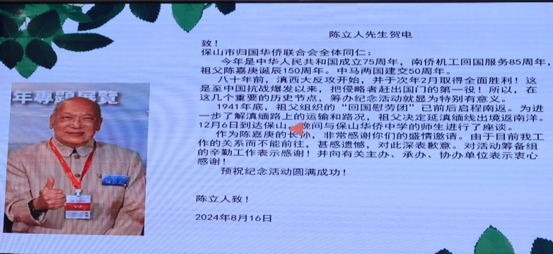 2024年,恰逢中华人民共和国成立75周年、滇西抗战胜利80周年、南侨机工回国抗战85周年。这次活动引起了海内外华侨华人的广泛关注,陈嘉庚先生长孙陈立人先生发来贺电:“在这几个重要的历史节点,筹办纪念活动就显为特别有意义”。马来西亚砂拉越华人研究会会长林韶华博士也发来贺电。