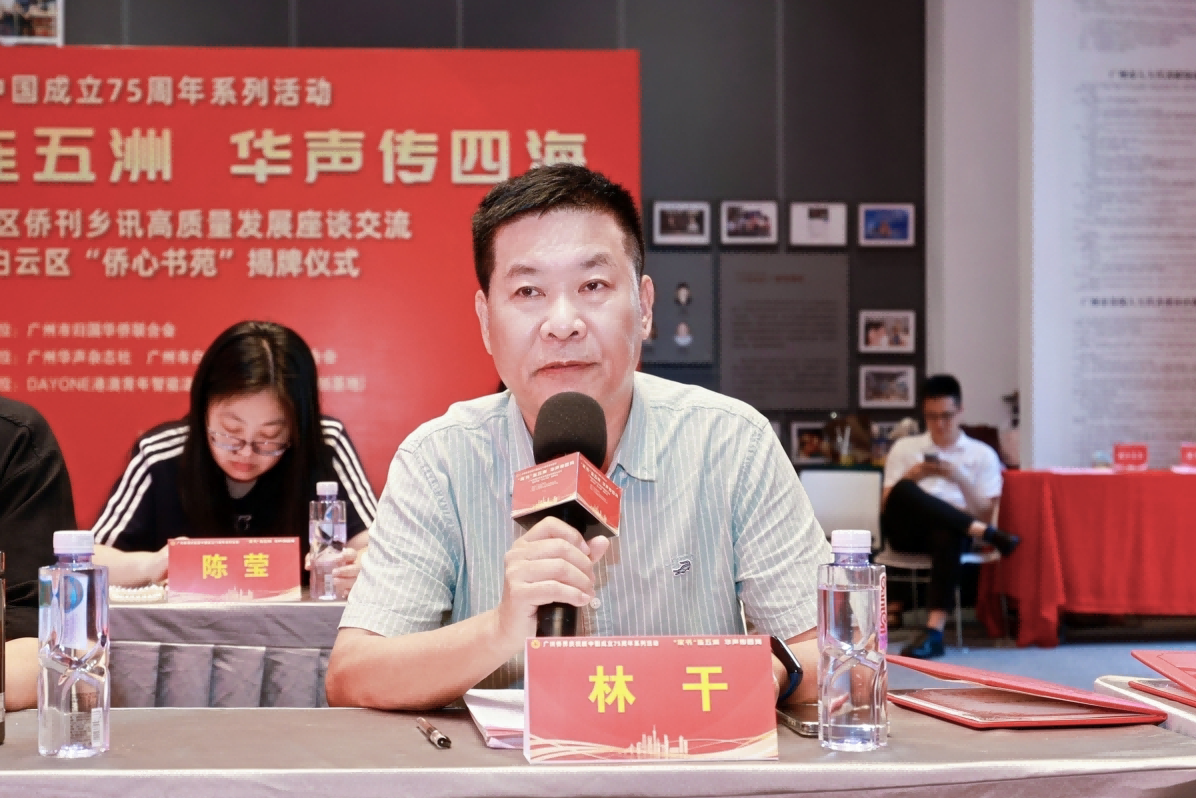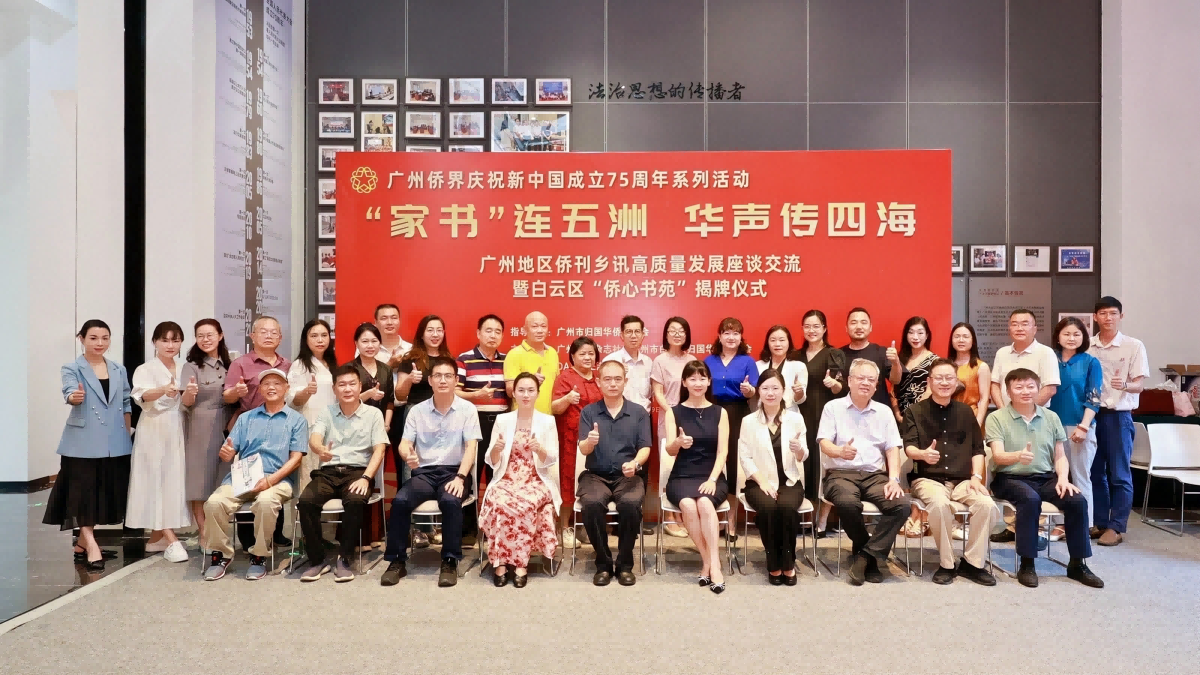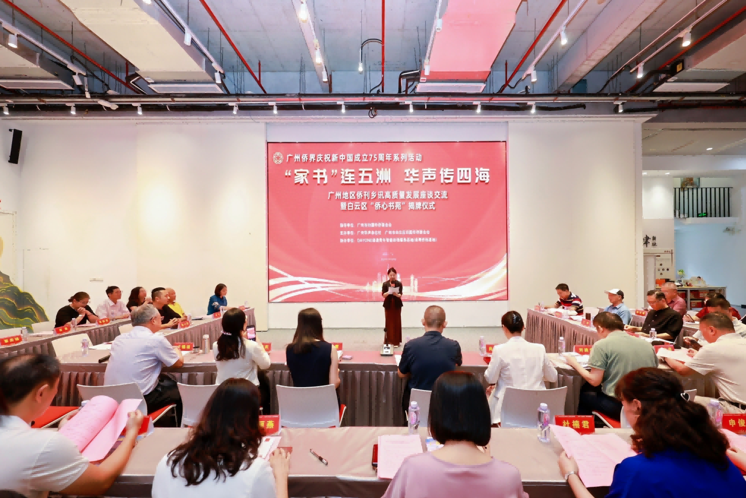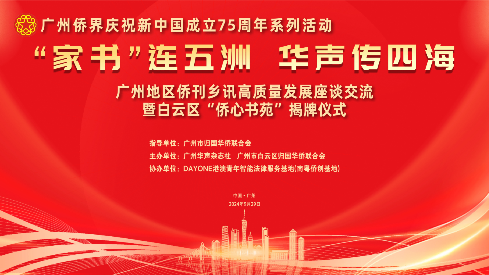 为庆祝中华人民共和国成立75周年,深入学习贯彻党的二十届三中全会精神,2024年9月29日,由广州市侨联指导、广州华声杂志社和白云区侨联主办、DAYONE港澳青年智能法律服务基地协办的广州侨界庆祝新中国成立75周年系列活动“‘家书’连五洲 华声传四海”——广州地区侨刊乡讯高质量发展座谈交流暨白云区“侨心书苑”揭牌仪式在南粤侨创基地举办。中国华侨出版社综合编辑室主任姜军、文教编辑室主任肖贵平,广东省侨联基层建设部(权益保障部)部长林建光,广州市侨联党组成员、副主席童慧,广东省期刊协会名誉会长卢锡铭以及省、市、区主要侨刊乡讯负责人及编辑骨干,白云区侨联主席李莉莉和番禺、增城、花都等区侨联负责人,广州侨界作者、读者代表等40人参加活动,共同探讨新时代下侨务外宣工作的新理念、新思路,为提升广州地区侨刊乡讯办刊质量,加强侨刊乡讯的国际传播效能,大力讲好中国故事、大湾区故事、广州故事贡献侨界智慧与力量。广州华声杂志社副社长肖文主持活动。