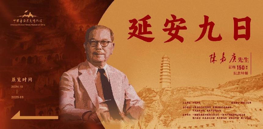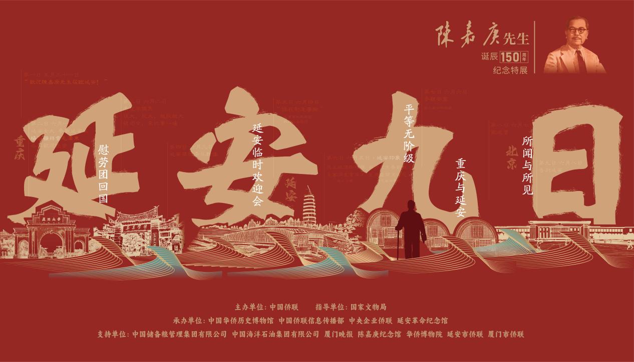 “延安九日——陈嘉庚先生诞辰150周年纪念特展”由主办、国家文物局指导,中国华侨历史博物馆、信息传播部、中央企业侨联、延安革命纪念馆联合承办。该展览是、国家文物局共同开展的“共和国印记——侨心共筑中国梦”主题活动中的重要一项,是纪念陈嘉庚先生诞辰150周年的主要活动之一。展览以嘉庚先生1940年访问延安的九天为主题重点,通过“摸索——客居南洋 心怀祖国”“追寻——延安九日 同向而行”“归来——共商国是 风范长存”三个部分,展示陈嘉庚先生与中国共产党同声相应、同心相知、同向而行的历史往事,再现广大华侨的爱国情怀,总结党的侨务工作优良传统与有效经验,团结引领广大侨胞将心系桑梓的深厚感情转化为新时代新征程上的奋斗动力,为新时代侨务工作改革创新提供历史启迪。展览将持续到2025年3月。