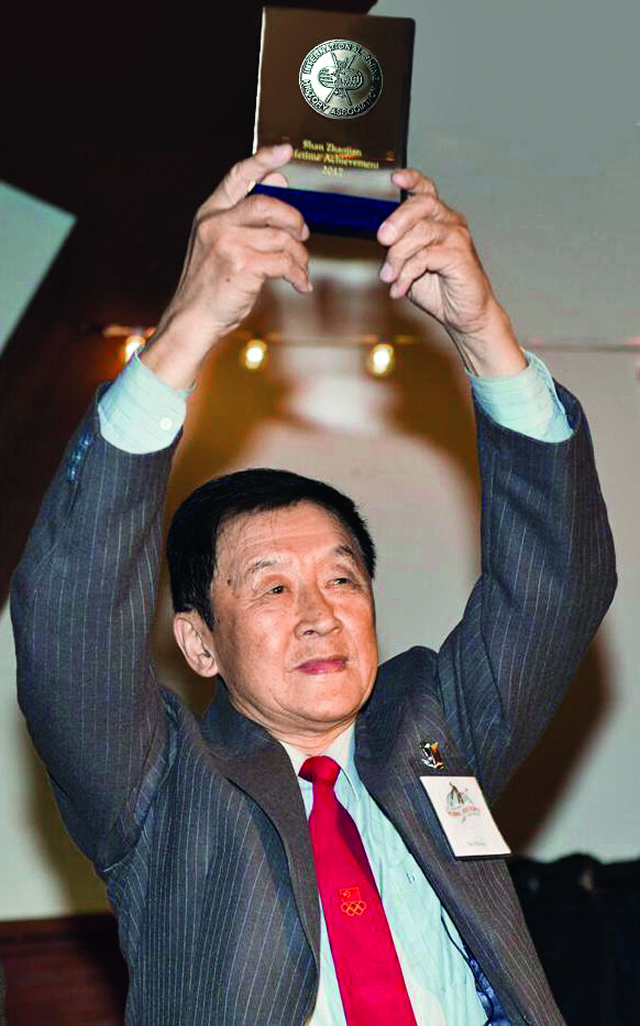单兆鉴高高举起“终身成就奖”奖牌