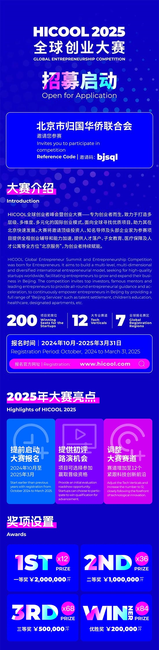 HICOOL全球创业者峰会暨创业大赛已成为具有全球影响力的创新型国际赛事,帮助创业者和初创企业在北京落地和发展。大赛将邀请顶级投资人、知名导师及头部企业家为参赛项目提供全程创业辅导和能力加速。获奖者可享受最高200万奖金、在京落户、子女上学、医疗保障等人才政策,有200个项目获奖席位。
