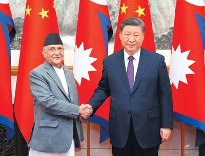 习近平赞赏奥利长期坚定致力于中尼友好事业,指出中国和尼泊尔是山水相连的好邻居、好朋友、好伙伴,两国始终真诚相待、相互尊重、相互支持,双边关系保持健康稳定发展。明年是中尼建交70周年。中方把中尼关系置于周边外交的重要位置,愿同尼方秉持建交初心,巩固传统友谊,推动中尼面向发展与繁荣的世代友好的战略合作伙伴关系取得新的更大发展。