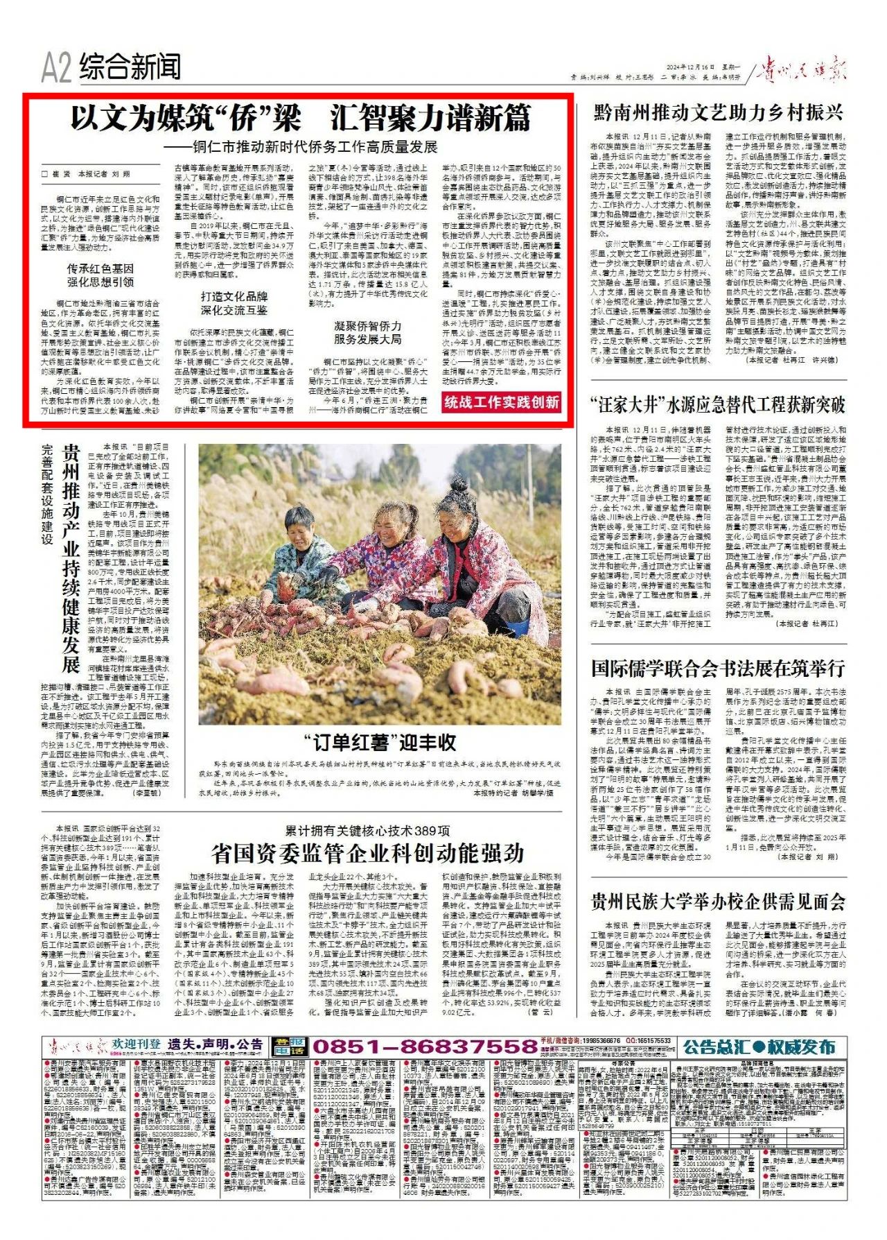 铜仁市坚持以文化凝聚“侨心”“侨力”“侨智”,将围绕中心、服务大局作为工作主线,充分发挥侨界人士在促进经济社会发展中的优势。