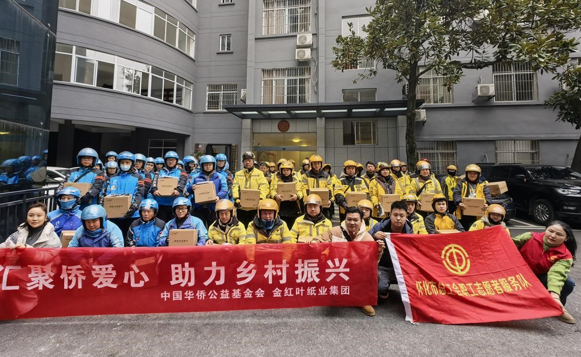 在爱心企业金红叶纸业集团的大力支持下,本次捐赠活动向乡村振兴帮扶点、敬老院及服务群众生活和城市发展建设的社会性服务群体共捐赠4000箱生活用纸。