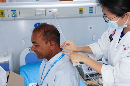 2024年12月24日,在斯里兰卡科伦坡港,中国海军“和平方舟”号医院船上的医生为当地居民做针灸治疗。2024年12月,执行“和谐使命-2024”任务的中国海军“和平方舟”号医院船停靠在科伦坡港。船上17个临床科室、5个辅助诊疗科室的100余名医护人员,可开展60余种检查治疗或手术。许多斯里兰卡民众不远千里而来,获得中国医生的诊疗救助。