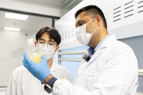 今年37岁的穆罕默德·沙巴兹来自巴基斯坦,目前在国内一家核医疗科研企业,从事精准放射治疗技术的研究推广工作。2006年,沙巴兹从巴基斯坦来到中国学医,至今已在中国生活了近20年。在中国工作期间,沙巴兹搭建平台帮助巴基斯坦学生来华求学,同时也邀请中国专家到巴基斯坦进行指导,为推动中巴在医学教育、科研及数字医疗等领域合作贡献着青年力量。这是2025年7月29日,沙巴兹(右)与同事在实验室内交流。