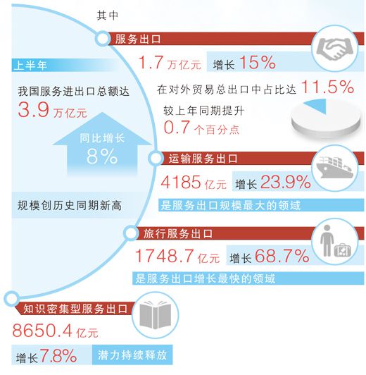 据新华社北京8月27日电 (记者谢希瑶)今年上半年,我国服务进出口总额创历史同期新高,旅行服务进出口规模超过1万亿元,增速达到12.3%。预计全年服务贸易仍将保持增长,贸易结构将持续优化。