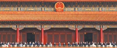大会开始前,习近平和夫人彭丽媛在端门外广场迎接出席大会的外方代表团团长及其配偶,并同他们合影留念。