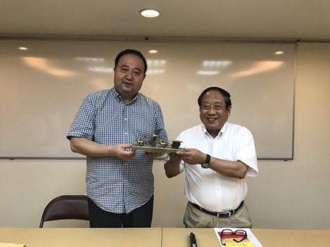 (“亲情中华”艺术团团长、中国侨联文化交流部部长刘奇向台湾中华侨联总会理事长郑致毅赠送秦铜车马模型)