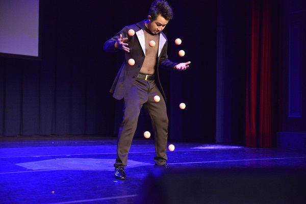 赵晗龙为侨胞表演杂技《拍球》