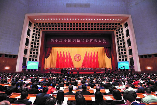 人民大会堂大礼堂灯光璀璨,气氛热烈。主席台上方悬挂着“第十次全国归侨侨眷代表大会”的会标,后幕正中象征着五大洲侨胞心向祖国的中国侨联会徽格外醒目,10面红旗分列两侧。二楼眺台悬挂着“紧密团结在以习近平同志为核心的党中央周围,坚持以习近平新时代中国特色社会主义思想为指导,团结凝聚广大归侨侨眷和海外侨胞,为实现中华民族伟大复兴的中国梦而努力奋斗!”巨型横幅。来自全国各地的近1300名归侨侨眷代表和来自110多个国家的近700名海外侨胞特邀嘉宾欢聚一堂。