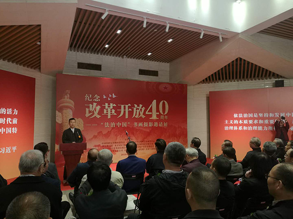 10月11日上午,由中国侨联法律顾问委员会、中国人民大学反腐败法治研究中心、荣宝斋画院、北京清正书画院等单位联合举办的“纪念改革开放40周年——‘法治中国’书画摄影邀请展”开幕式在炎黄艺术馆举行。