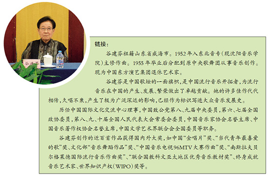 作为归国华侨杰出代表,谷建芬1935年生于日本大阪,1941年回国,是中国流行音乐的开拓者,为流行音乐在中国的产生、发展和繁荣做出贡献,如今年逾八十的谷建芬仍创作不辍,推出少儿系列歌曲《新学堂歌》。