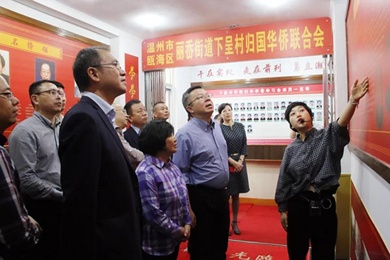 8日至9日,李波一行赴浙江省温州市出席“2018世界温州人大会”开幕式,走访基层侨联组织并听取了温州市政协副主席、市侨联主席谢树华关于侨联基层组织建设和为侨服务体制机制创新等的工作汇报。在瓯海区丽岙街道下呈村侨联,李波听取了村侨情侨史介绍,同村侨联工作者深入交流,仔细询问“党建带侨建”工作推进和活动开展情况。在丽岙街道,李波参观了侨史馆和侨联办事大厅,详细了解侨联基层组织工作机制和开展为侨服务具体内容,并勉励丽岙街道侨联始终坚持为侨服务宗旨,在更好发挥侨联基层组织作用、创新社会管理等方面作出新的探索。