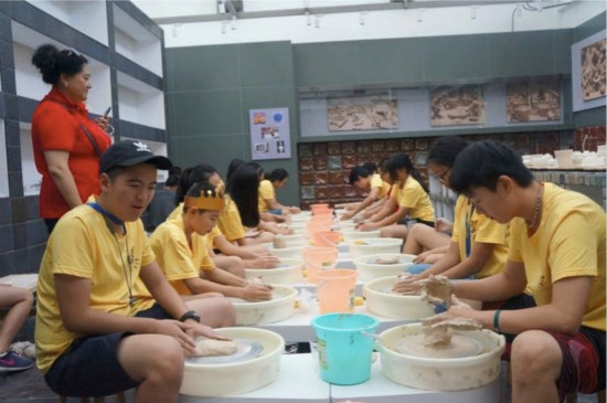 一进入陶瓷馆,看着精美的中国瓷器,营员们不禁纷纷发出感叹。老师耐心细致地为大家讲解着陶瓷知识,并亲自为营员们示范如何练泥、拉坯、成型,并示范如何用陶土制作杯子。在对陶艺有了大致的了解后,营员们迫不及待地开始学着动手制作陶艺品。