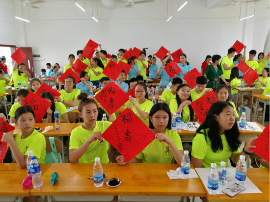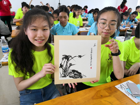 7月20日,营员们在贺州学院西校区逸夫楼进行书法和中国画两门课程的学习。书法课上,授课教师刘玉菲耐心细致地介绍书法博大精深的文化,并教营员们写“福”和“寿”字,让营员们合作完成作品的撰写;中国画课上,营员们一边细细体会线条的粗细、用笔的深浅,一边认真练习、互相配合,共同完成了兰花作品的绘画。