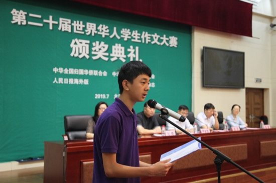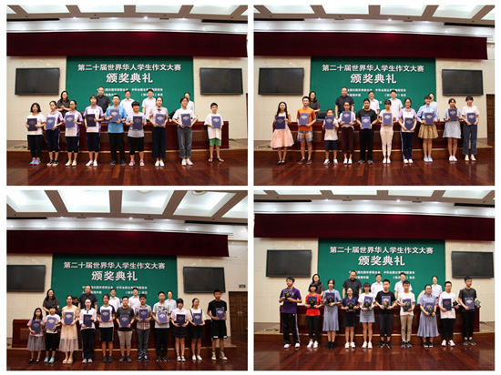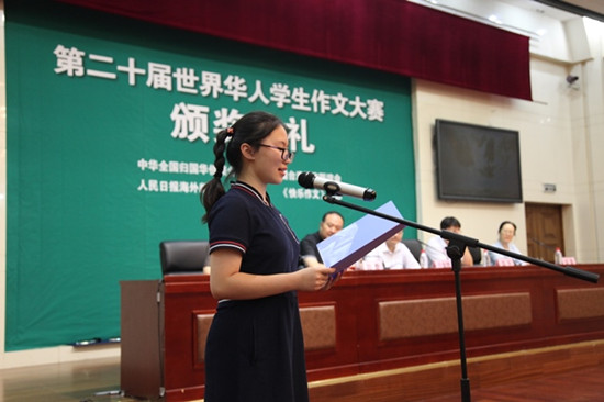 在颁奖典礼上,中国侨联文化交流部部长刘奇介绍了本届大赛组织评选情况,全国台联副会长郑平宣读了大赛评奖结果。特等奖获得者杜劭晨朗读获奖作文《我与古典诗词的相遇》,特等奖获得者张泊远朗读获奖作文《嗅里乾坤》,山东省青岛市胶州市教育局高中教研室主任卢正国代表组织奖单位发言,日本同源中文学校教师杨林代表获奖教师发言。人民日报海外版科教部主任刘菲宣布第二十一届世界华人学生作文大赛启动。