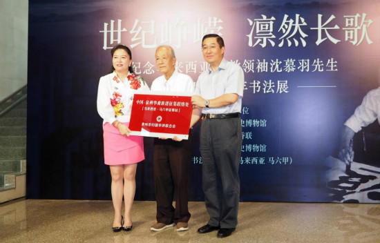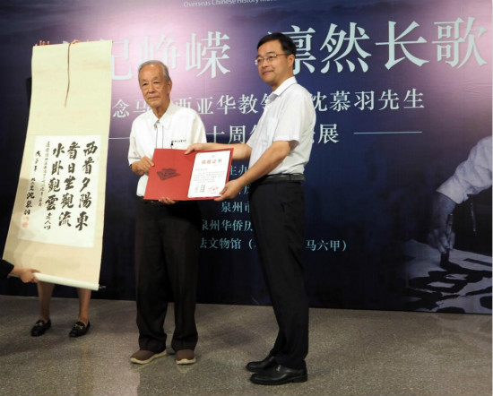 泉州市侨联副主席钟文玲在致辞中介绍,沈慕羽生前十分关心家乡发展,曾于96岁高龄撰写“海滨邹鲁 泉郡圣贤”巨幅书法作品赠予泉州华侨历史博物馆收藏。举办此次展览将使沈慕羽的感人事迹广为传播,也将推动中马间的文化交流、文明互鉴,在促进“一带一路”民心相通上发挥积极作用。