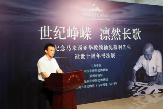 7月30日上午,“世纪峥嵘 凛然长歌——纪念马来西亚华教领袖沈慕羽逝世十周年书法展”在中国华侨历史博物馆开幕。展览由中国华侨历史博物馆、泉州市侨联、泉州华侨历史博物馆、沈慕羽书法文物馆(马来西亚 马六甲)共同主办。中国侨联顾问乔卫出席开幕式并为沈慕羽书法文物馆颁发牌匾,中国侨联副主席齐全胜出席开幕式并为沈慕羽亲属代表沈墨义颁发中国华侨历史博物馆捐赠证书。