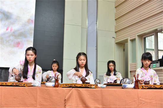 闭营仪式上的文艺表演,华裔青少年们用美国带来的黑管吹奏着《茉莉花》、穿着汉服端着茶壶用毛笔书写着汉字......每个节目都尽显中华风情。在学院报告厅小小的舞台上,领队、营员及带队导游自编自导,用精彩的节目诉说了对中华文化的热爱。领队与营员深情地演出了《大中国》、《把根留住》合唱,挥舞着旗帜,孩子们用不标准的普通话动情地歌唱,表达出对中华民族的深情。