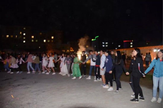 入夜的草原篝火熊熊,大家随着悠扬的马头琴声,唱起热情的祝酒歌。蒙古族姑娘跳起了别具风情的安代舞开场舞蹈,踩着音乐的节拍,来自各国的营员们纷纷加入了跳舞的队伍中。有的营员在气氛的烘托下,忍不住跳起了街舞,两种风格迥异的舞蹈,在激昂的音乐中,和谐地交融在了一起,引得大家一阵叫好,掌声经久不息。