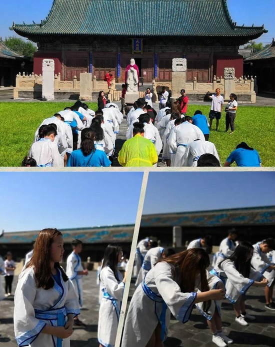 “鼓三通,正衣冠,行礼乐”,来自蒙古国的40名营员身着汉服,在礼仪老师的指导下,在代县文庙向孔子行礼。
