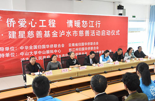 省侨联党组成员、副主席高峰,广东省天行健慈善基金会秘书长常青、中山大学中山眼科中心专家团队和泸水市委、州侨联及市侨联领导出席启动仪式。高峰指出,为响应国家开展精准扶贫、实施乡村振兴战略的决策部署,发挥海内外侨胞的资源优势,助力深度贫困地区开展脱贫攻坚工作。今年6月,在“侨连五洲·七彩云南”第17届东盟华商会暨第1届“一带一路”侨社论坛活动期间,中国侨联与云南省政府签署《实施精准扶贫、助力乡村振兴合作备忘录》,未来4年,中国侨联将组织捐助5000万元人民币助力我省脱贫攻坚和乡村振兴,作为其中项目之一,广东省天行健慈善基金会等7家涉侨基金会分别与云南华商公益基金会、5个深度贫困地区的市(县)侨联签署了“一对一”结对帮扶协议。计划在今后4年,对包括泸水市、福贡县、贡山县在内的5县(市)每年捐助价值不少于50万元人民币的款物,实现“千侨助千家”的目标,助力云南贫困地区群众早日过上幸福美好生活。