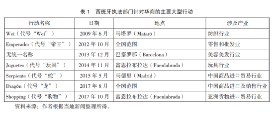 除了西班牙民众和企业家外,西班牙政府的一系列针对华人移民企业家的执法行动同样让中国企业家们深陷舆论漩涡。其中,最具有代表性的是2012 年的“帝王行动”。在此次行动中,西班牙知名华商被捕,检方指控以其为首的犯罪团伙涉嫌走私中国货物,4年内共洗黑钱12 亿欧元。经当地媒体报道后,西班牙社会上下哗然,客观上使得之前社会上流传的谣言和臆测坐实,这使华人企业家在西班牙的社会形象受到重创。此后,一系列针对华商的经济犯罪调查行动时有发生,并呈日益频繁之势,密集的传统行业成为打击重点(见表1)。
