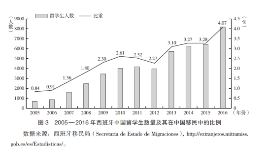 2007 年,西班牙在册中国移民数量突破10 万。持续增加的移民数量一方面带来了传统行业难以吸收的过剩劳动力,进而促进了小微个体企业的诞生,如咖啡馆和酒吧;另一方面,也使一些有别于早期移民的新的群体的数量得以增加,其中,最具有代表性的便是中国留学生群体(见图3)。