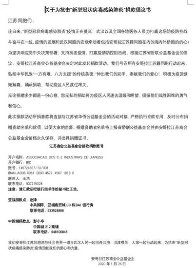 在加拿大,善行义举温暖人心,加国华人情牵疫区,加拿大爱心慈善基金会、加拿大扬州同乡会等侨团纷纷行动起来捐钱捐物,累计捐款200人次,总金额超60万,采购急需医用消毒液1万瓶;加拿大江苏华人联合总会徐凌女士联合长江医药集团在海外发起募捐行动,短短的两天时间,就办妥募捐、寻找医护用品、开通东航在洛杉矶的航空绿色通道等事宜。在德国,德国江苏总商会会长王荣虎博士以及各位理事发出捐款捐物倡议,并提供欧元、人民币、物品三条捐助渠道。在安哥拉,各种应急物资从海外源源不断地送回国内。在菲律宾,江苏商会会长谭志向盱眙县捐赠5000只口罩。在日本,旅日华人中岛毅在朋友圈一看到省华侨公益基金会的倡议,就立即通过微信转账1000元。在巴西,巴西巴中经贸交流会方激女士,第一时间捐赠10000元……还有很多来自加拿大、美国、日本、巴西、安哥拉、埃及、肯尼亚等国的江苏籍海内外侨胞纷纷来电咨询、接洽捐款捐物相关事宜。