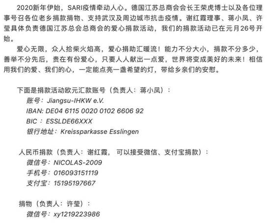 2020新年伊始,新型冠状病毒感染的肺炎疫情,始于武汉,牵动万家,举世关注,让这个庚子鼠年的春节显现得那么不平凡。“我们在这儿过年,你们却在帮我们过关!”武汉以及全国各地医务人员为打赢这场防疫防控战正奋斗在一线。“隔离病毒,但绝不会隔离爱!”疫情的发展和同胞的安危同样牵动着海内外侨胞的心!1月26日,江苏省华侨公益基金会发出倡议:江苏籍海内外侨团和海外侨胞、归侨侨眷行动起来,为疫区捐赠款物,特别是医用耗材、防护用品等。