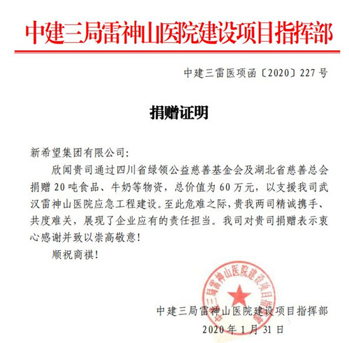 自新冠疫情发生以来,新希望集团已有数百名员工战斗在防疫抗疫的第一线:新希望兴源120余名工程技术骨干克服万难日夜赶工,支援火神山、雷神山医院污水处理系统攻坚建设;1月30日下午,新希望六和、新希望乳业捐赠的20吨食品物资已由鲜生活冷链物流运抵武汉,由湖北慈善总会接收,专项支援火神山雷神山施工人员。