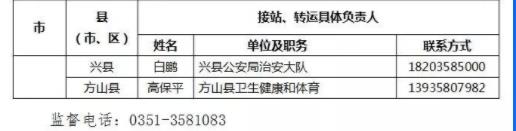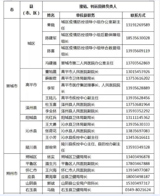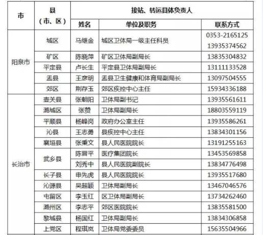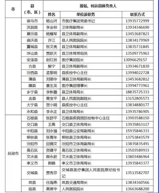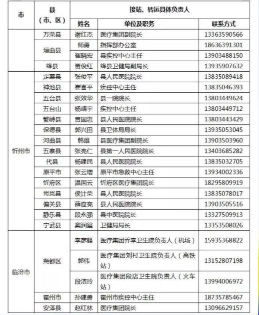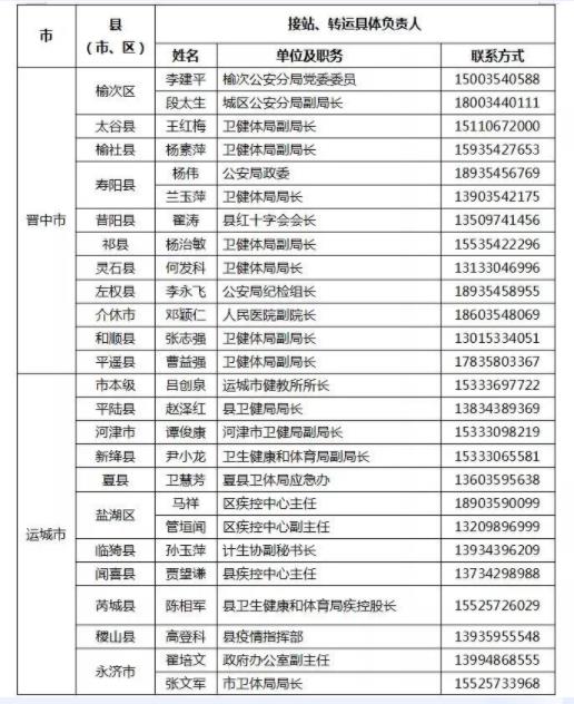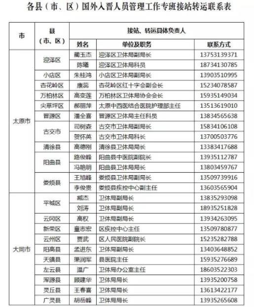 3、为严格落实国外入晋人员点对点闭环管理,方便国外入晋人员及时联系属地,落实隔离管理措施,山西省以县为单位成立了国外入境人员管理工作专班。各县(市、区)国外入晋人员管理工作专班接站转运联系方式如下: