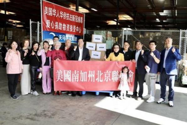 2020年2月,美国南加州北京联谊会的干部与会员在捐献物资现场。(美国《侨报》/邱晨 摄)