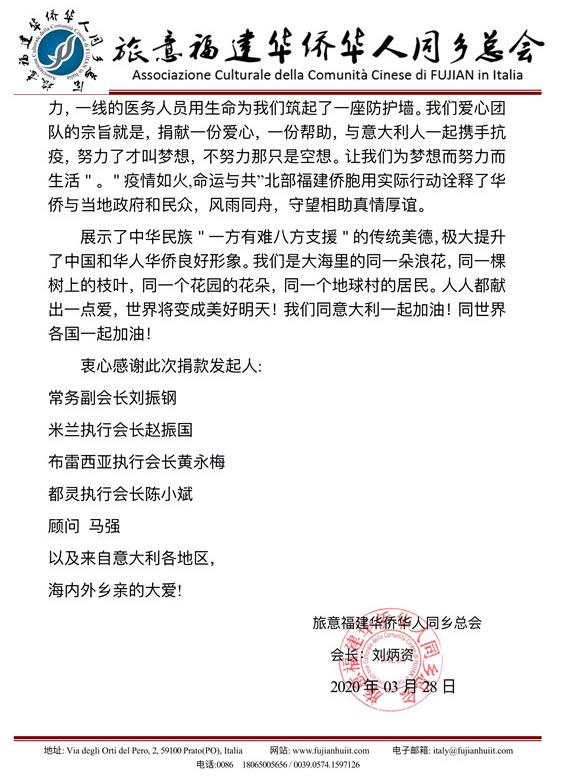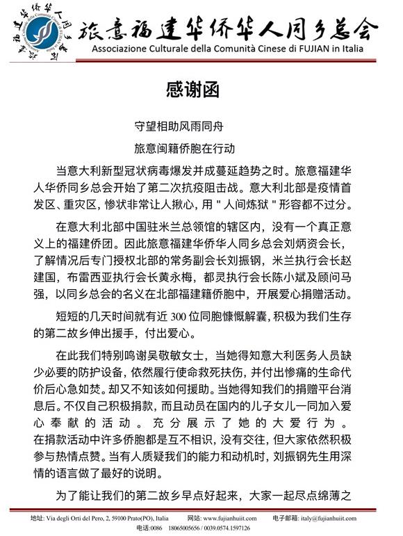 “疫情如火,命运与共”。旅居意大利北部福建侨胞用实际行动,诠释了华侨华人与当地政府和民众风雨同舟、守望相助的真情厚谊,展示了中华民族“一方有难八方支援”的传统美德,极大地提升了中国和华侨华人的良好形象。