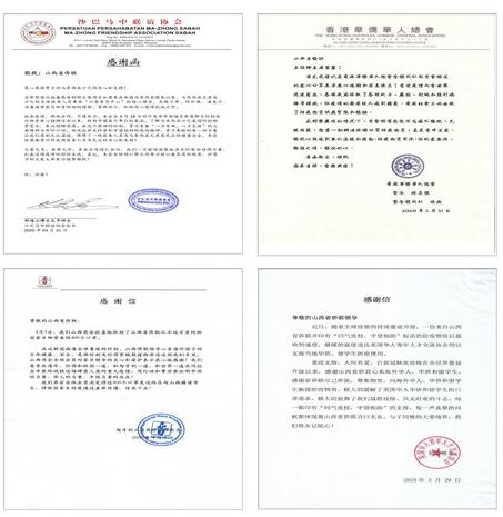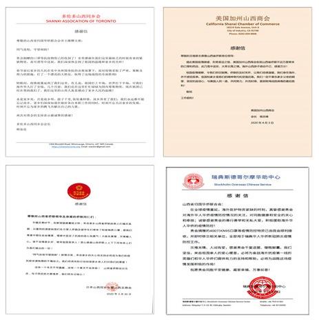 美国加州山西商会、多伦多山西同乡会、英国华人青年人才交流协会、英国考文垂大学、瑞典斯德哥尔摩华助中心、匈牙利山西商会、沙巴马中联谊协会、日本山西总商会/日本山西同乡会、香港华侨华人总会等海外侨(社)团发来感谢信。“每一箱印有‘同气连枝、守望相助’的支持,每一声真挚的问候都体现着山西省侨联岂曰无衣、与子同袍的大爱境界,我们将永记铭心”“灾难无情、人间有爱,感谢千里送援、慷慨解囊”“大爱无言、善举无价”“疫情当前,来自家乡的关心和支持必将成为我们防疫抗疫安渡险期的不竭动力”“防疫物资有限,但爱无限,侨谊之情,铭记于心”…………感谢的言语虽短,却句句见证着祖国人民、家乡亲人与海外侨胞心心相印、守望相助的同胞情谊。